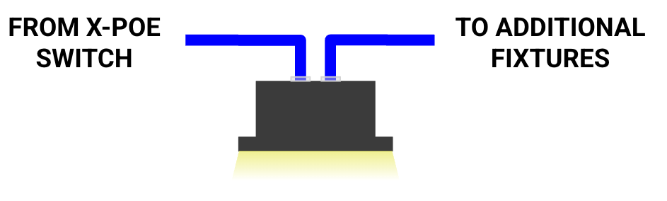 The XPD takes the RJ45 connection from an X-PoE port and converts it to one or two separate channels, each with a pair of positive (+) and negative (-) conductors. These channels are used for powering LEDs or other compatible devices, and can be daisy-chained to extend the power delivery to additional fixtures or devices. The XPD can be integrated (or not integrated) with the fixture in the following ways: